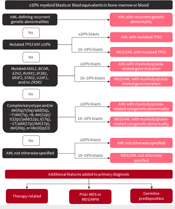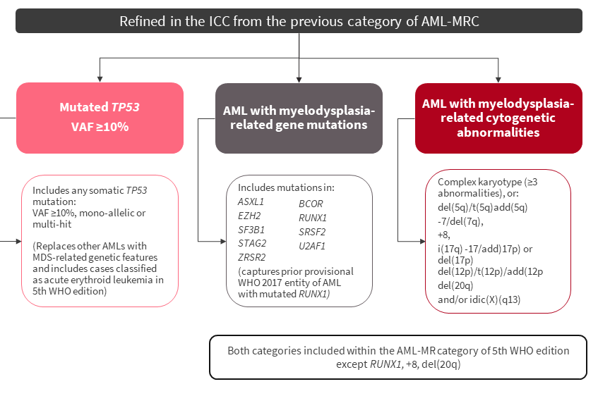 AML, acute myeloid leukemia; AML-MR, acute myeloid leukemia, myelodysplasia-related; AML-MRC, acute myeloid leukemia with myelodysplasia-related changes; ICC, International Consensus Classification; VAF, variant allele frequency; WHO, World Health Organization.