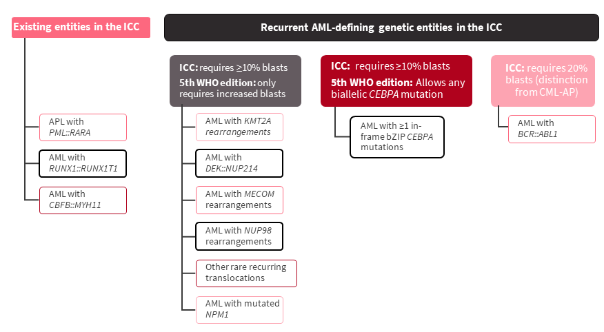 AML, acute myeloid leukemia; APL, acute promyelocytic leukemia; CML-AP, chronic myeloid leukemia - accelerated phase; ICC, International Consensus Classification; WHO, World Health Organization.