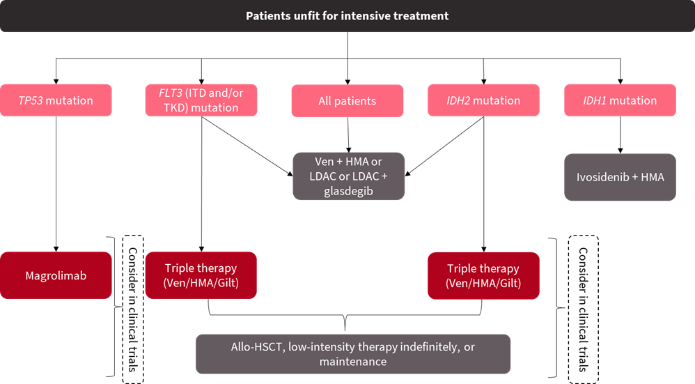 Allo-HSCT, allogeneic hematopoietic stem cell transplantation; AML, acute myeloid leukemia; Gilt, gilteritinib; HMA, hypomethylating agents; ITD, internal tandem duplication; LDAC, low-dose cytarabine; TKD, tyrosine kinase domain; Ven, venetoclax.