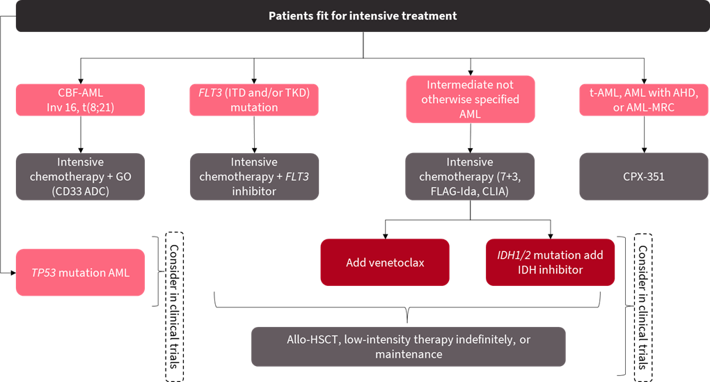 ADC, antibody drug conjugate; AHD, antecedent hematological disorder; allo-HSCT, allogeneic hematopoietic stem cell transplantation; AML, acute myeloid leukemia; CBF, core binding factor; CLIA, cladribine, idarubicin, cytarabine; FLAG-Ida, fludarabine, cytarabine, granulocyte-colony stimulating factor and idarubicin; GO, gemtuzumab ozogamicin; ITD, internal tandem duplication; MRC, myelodysplasia-related changes; t-AML, therapy-related AML; TKD, tyrosine kinase domain.