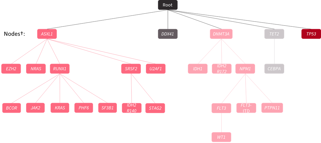 †Each node represents a gene mutation, and each branch describes the evolution of different possible pathways of leukemogenesis by inferring the sequence of mutation acquisition.