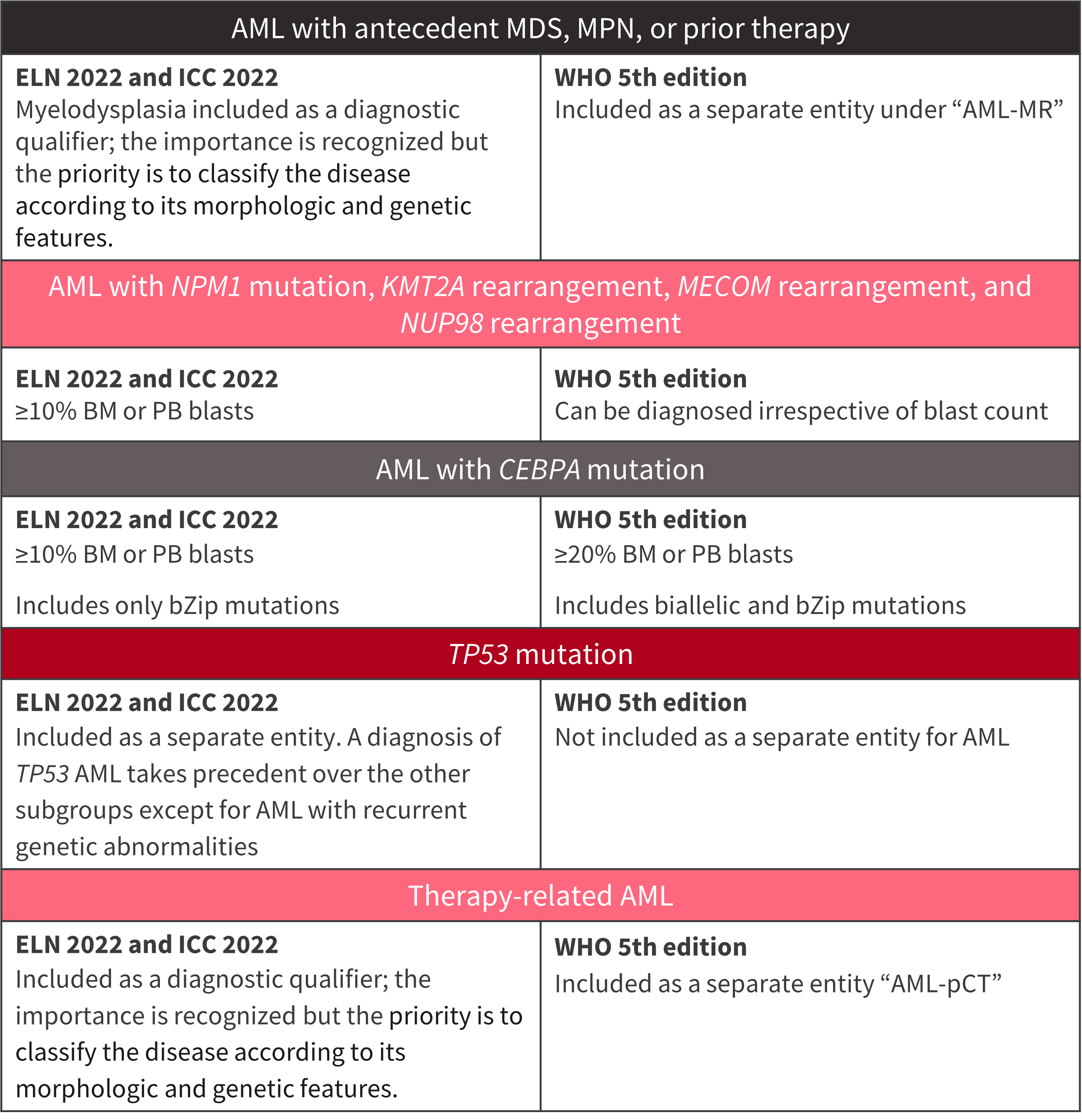 Figure 1. Clinically relevant differences between the ELN 2022 recommendations, the ICC 2022, and the 5th edition of the WHO classification*