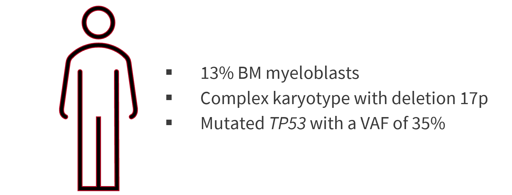 Based on the 2022 ELN and ICC systems, this patient would be classed as having MDS/AML with mutated TP53, due to her blast percentage being <20%, the absence of AML-associated mutations, and a VAF of TP53 mutations ≥10%. However, under the 5th edition of the WHO classification, they would fall under the ‘MDS with biallelic TP53 inactivation’ category.