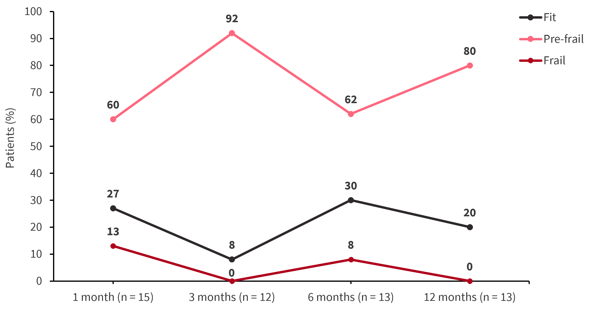 Overall, 65% of patients experienced a decline in fitness post-HSCT. The mean FFP declined over time reaching frail status at 6 months in patients who died within the first year. However, mean FFP stabilized at 3–6 months and improved at 12 months in patients who survived (Figure 1, Figure 2). The 1- and 2-year OS rate was 74% and 58% for the overall population, respectively. Using 6-month frailty status, patients who were pre-frail showed an improved 18-month OS rate compared with patients who were frail (92% vs 50%; p = 0.005).
