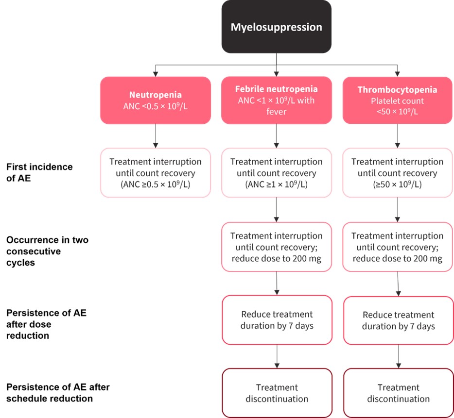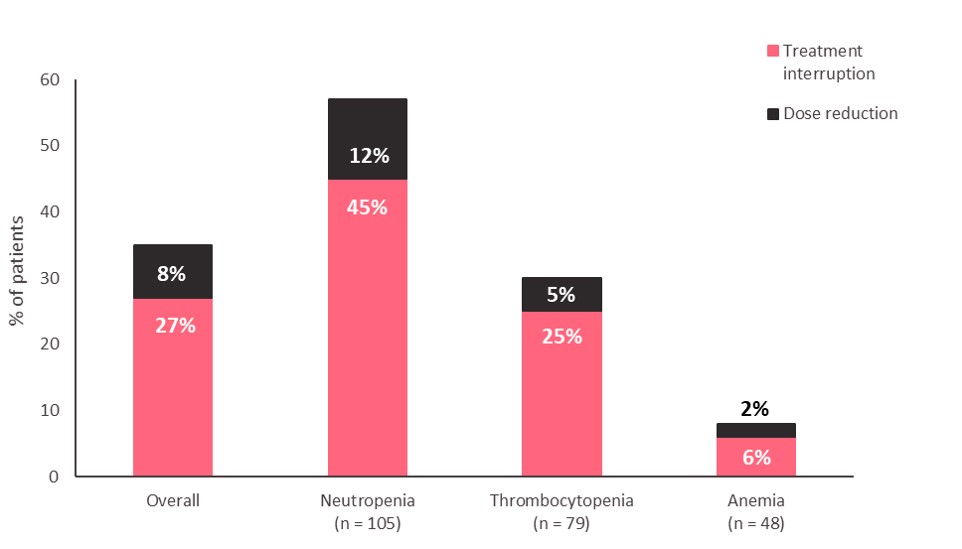 Overall, this study demonstrated a manageable safety profile for oral azacitidine maintenance, with a low number of patients discontinuing treatment. Similar to GI effects, hematologic AEs were controlled mostly through dose reductions and treatment interruptions, in adherence with expert guidelines. Implementation of these interventions will help improve treatment adherence and survival outcomes. Regarding the overlap of cytopenia in cases of relapse and azacitidine treatment, investigators noted that persistent neutropenia and cytopenia following dose modification and schedule changes may signal oncoming relapse.