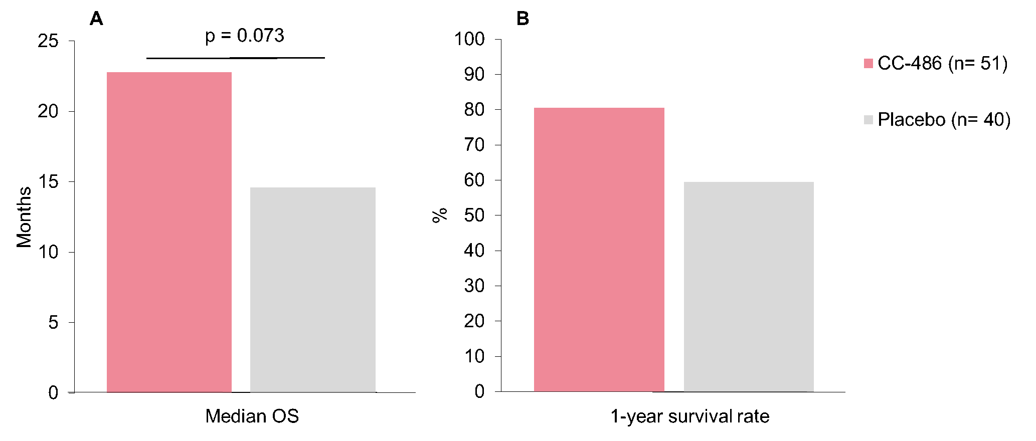 Figure 2. A Median OS and B 1-year survival rates among patients that received an escalated, 21-day dosing schedule of CC-486 vs placebo in the QUAZAR AML-001 study. OS, overall survival
