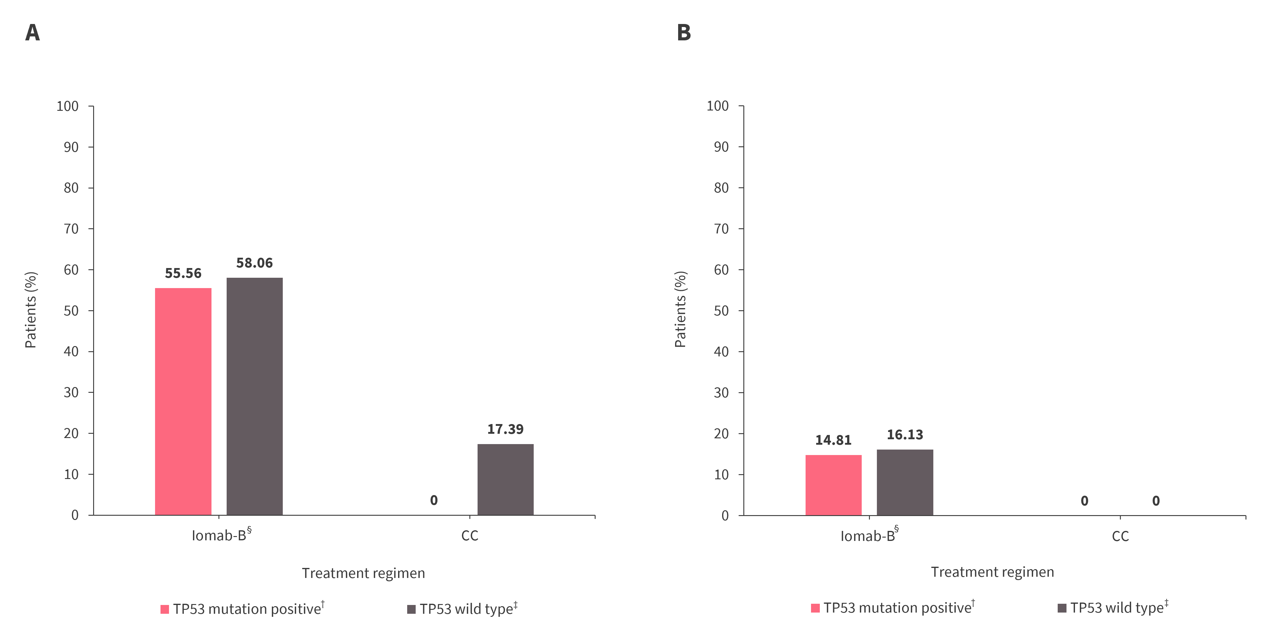 Figure 1. Rates of A CR and B durable CR in patients treated with Iomab-B or CC who were TP53 mutation positive or TP53 wild type*