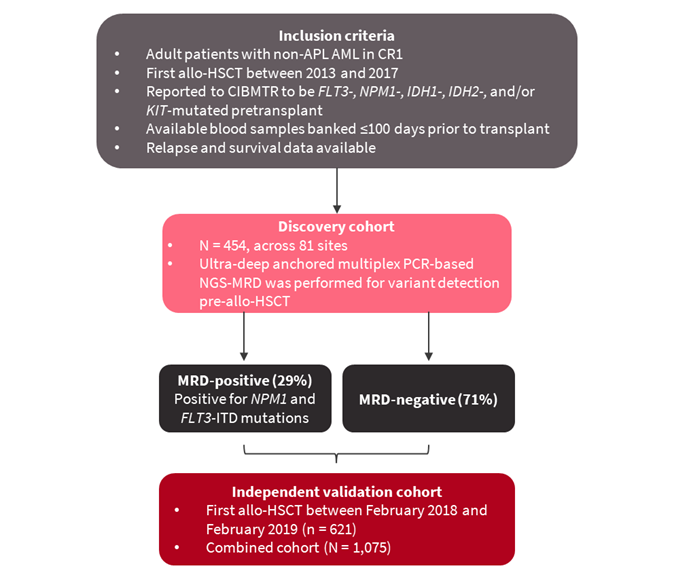 Allo-HSCT, allogeneic hematopoietic stem cell transplantation; AML, acute myeloid leukemia; CIBMTR, Center for International Blood and Marrow Transplant Research; CR1, first complete remission; MRD, measurable residual disease; NGS, next-generation sequencing; non-APL AML, non-acute promyelocytic leukemia AML.