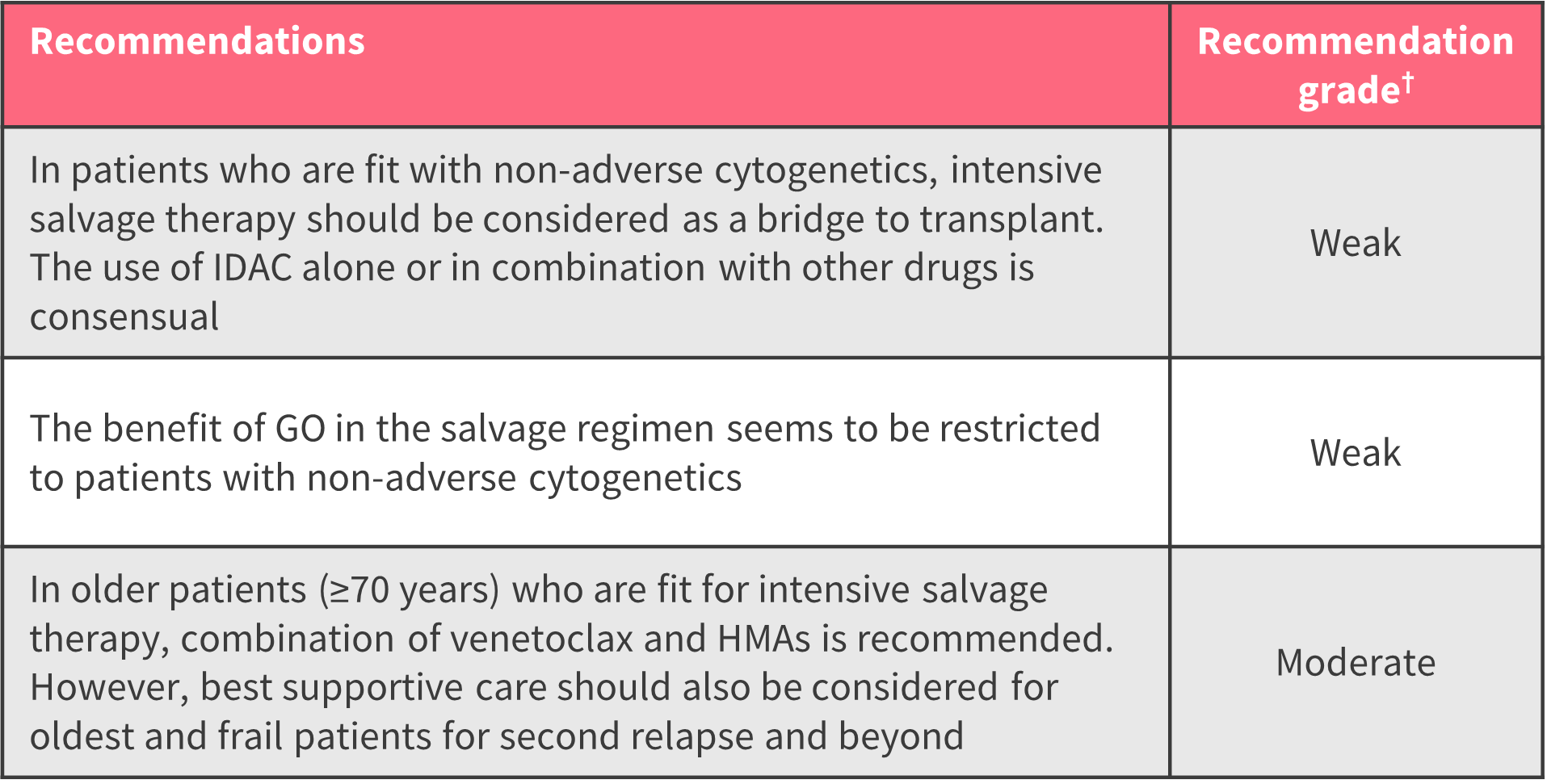 Several retrospective studies have found intensive salvage therapy to extend survival in patients who were fit with non-adverse cytogenetics, the panel considered this as a bridge to transplant (Figure 4). The addition of gemtuzumab ozogamicin to salvage therapy is associated with improved outcomes; however, the potential toxicity of gemtuzumab ozogamicin remains uncertain.