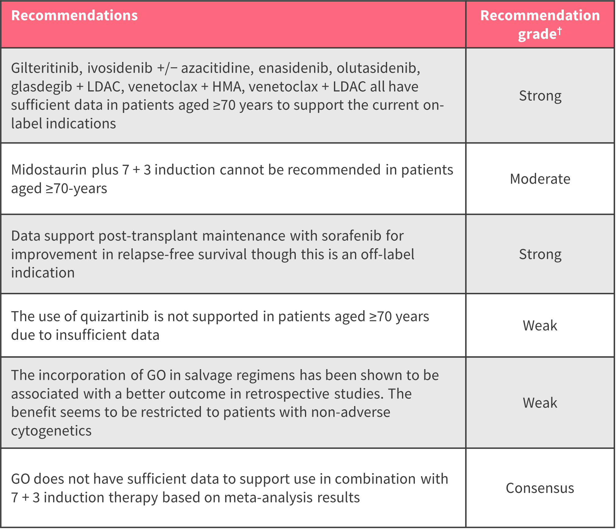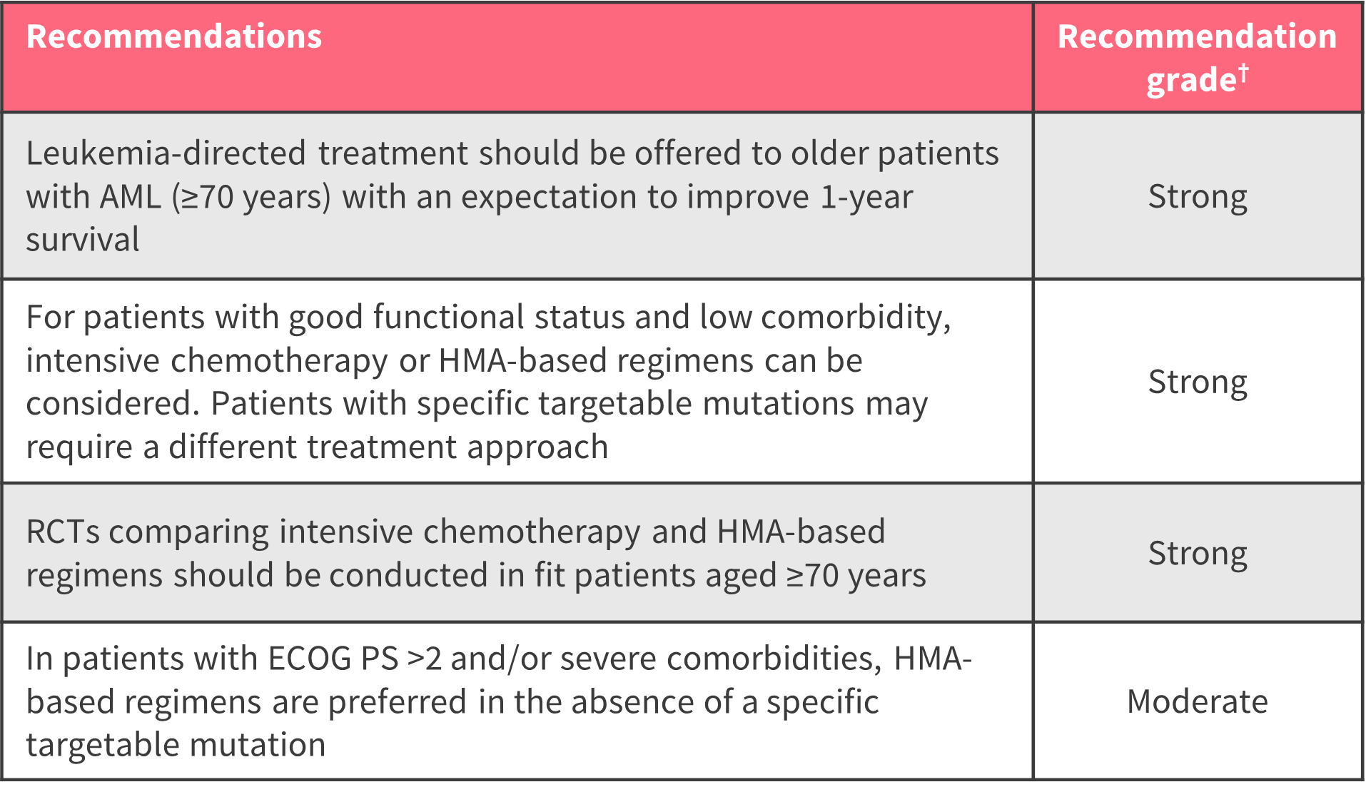 The recommendations from SIOG provide a helpful guide for the management of older patients (70 years or older) with AML and highlight a population that is underrepresented in clinical trials. The SIOG expert panel strongly recommended generating direct evidence in this population, while integrating information from GA to improve external validity and outcomes. The SIOG expert panel also noted that combinations of HMAs and targeted therapies are rapidly evolving, and physicians should stay up to date on these developments and their impact on the treatment landscape.