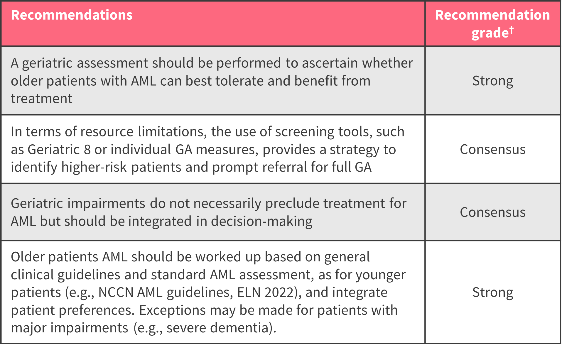 The panel identified increasing evidence supporting the need for geriatric assessment (GA) in older patients with AML, with GA also sensitive to functional and mental health status and correlated with survival outcomes. The prevalence of geriatric issues in these patients is high, and impaired cognitive and physical function are associated with reduced survival in patients undergoing intensive chemotherapy; however, in resource-limited settings, it can be challenging to implement routine GA.