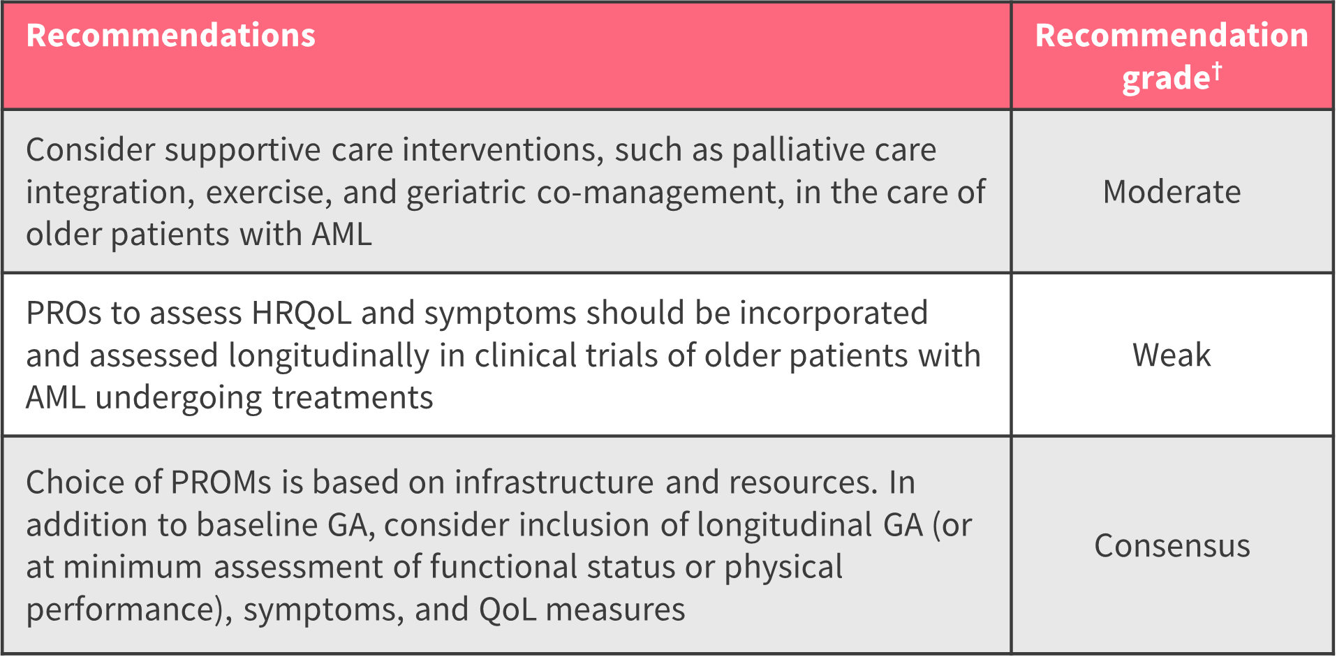 AML, acute myeloid leukemia; GA, geriatric assessment; HRQoL, health-related quality of life; PRO, patient-reported outcome; PROM, patient-reported outcome measure; QoL, quality of life.
