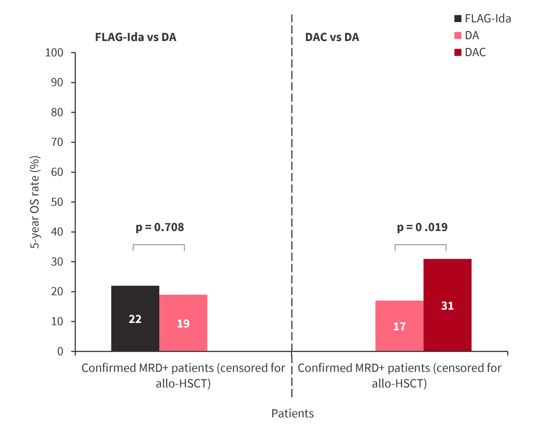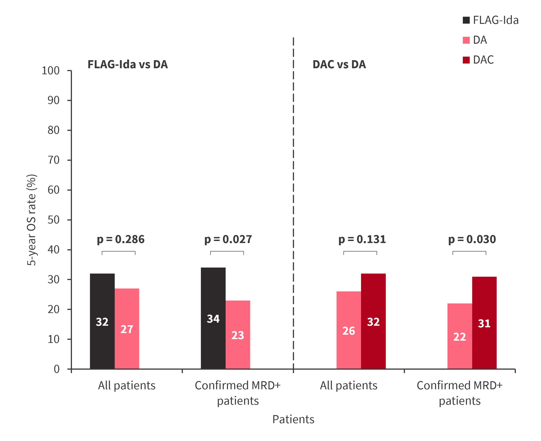 DA, daunorubicin + cytarabine; DAC, DA with cladribine; FLAG-Ida, fludarabine, cytarabine, granulocyte-colony stimulating factor, and idarubicin; MRD, measurable residual disease; OS, overall survival.