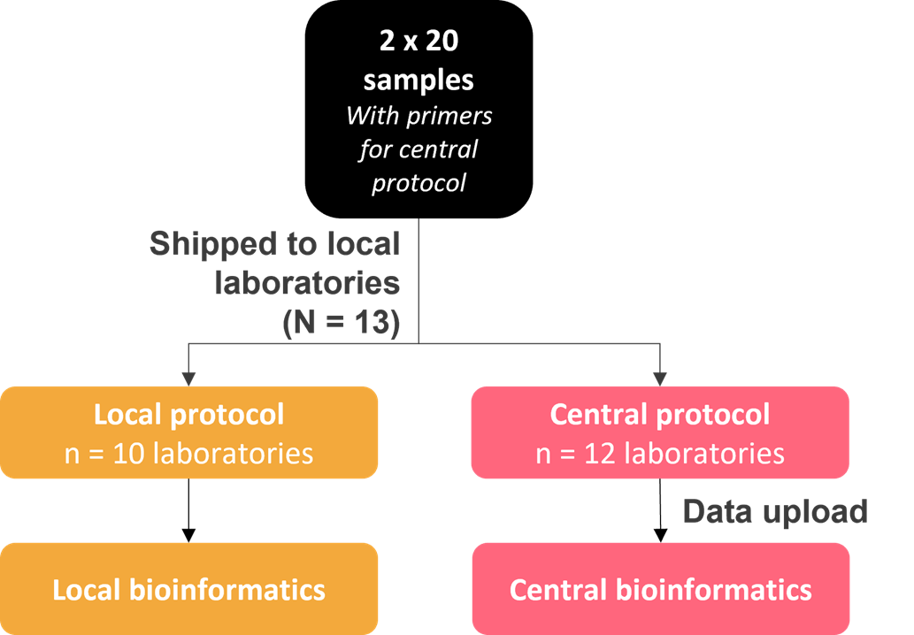 Using local protocols, the number of aligned sequencing reads was often similar within each laboratory, but different among the participating laboratories. In contrast, when using the central protocol, there were similar results within each laboratory and between different laboratories.