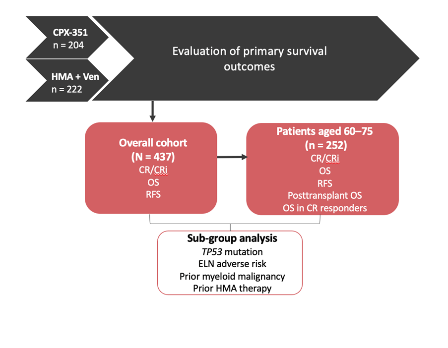 CR, complete remission; CRi, complete remission with incomplete hematologic recovery; ELN, European leukemiaNet; HMA, hypomethylating agent; OS, overall survival; RFS, relapse-free survival; Ven, venetoclax.
