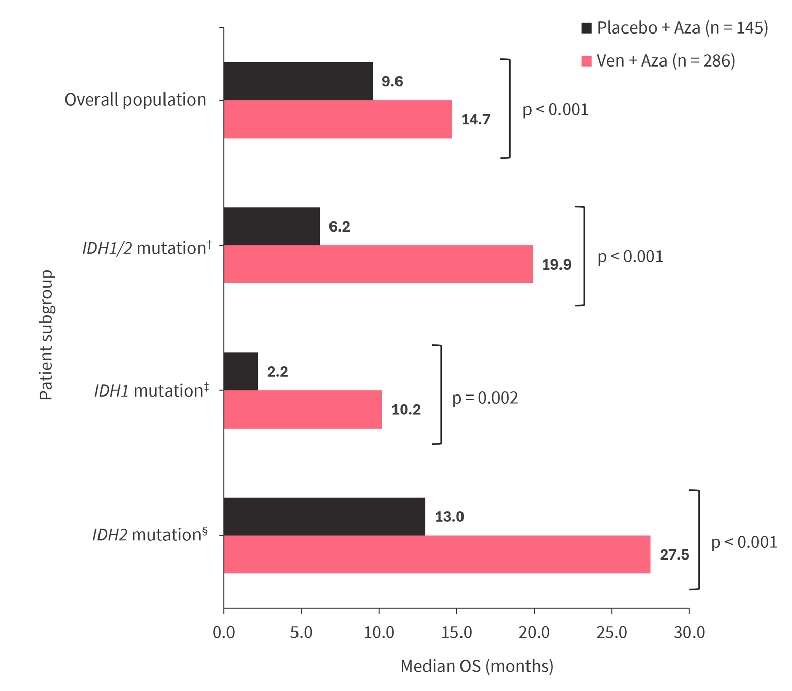 The combination of venetoclax (Ven) + azacitidine (Aza) was approved in 2018 for the treatment of patients with newly diagnosed acute myeloid leukemia, aged ≥75 years old, or ineligible for intensive chemotherapy. The phase III VIALE-A trial (NCT02993523) evaluating Ven + Aza vs placebo + Aza met its primary endpoint of improved overall survival (OS).