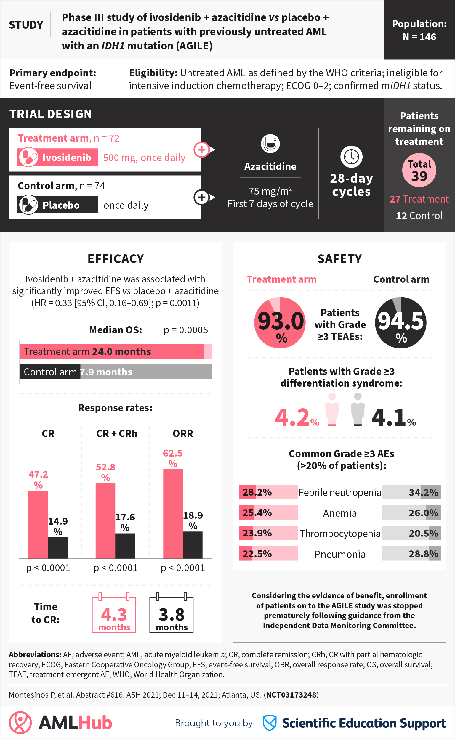The AML Hub is happy to present a Visual Abstract representing key data from the phase III AGILE study, evaluating ivosidenib + azacitidine vs placebo + azacitidine in patients with previously untreated IDH1-mutant acute myeloid leukemia (AML).