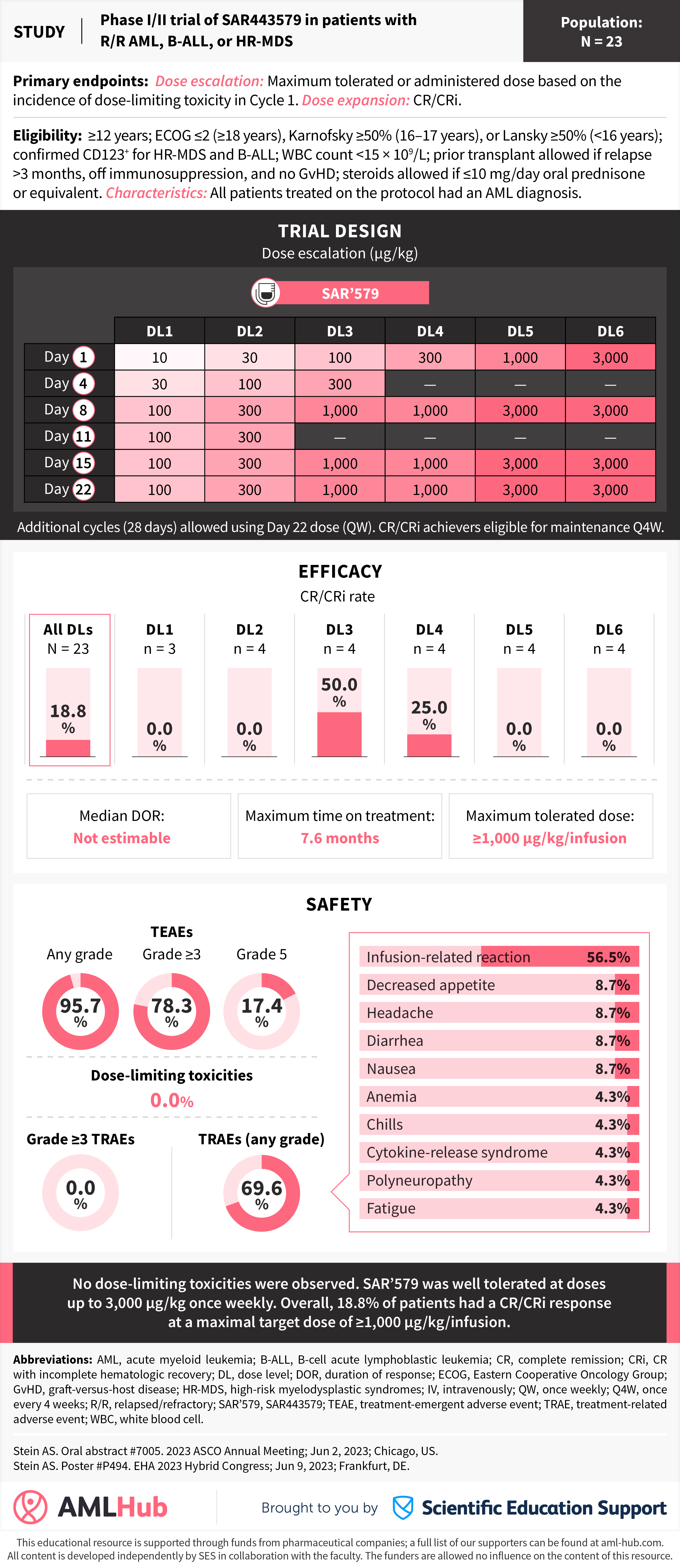 The AML Hub is pleased to present a visual abstract summarizing the preliminary safety and efficacy results from the phase I/II trial (NCT05086315) investigating SAR443579 (SAR’579), a trifunctional anti-CD123 NKp46×CD16 natural killer cell engager, in patients with relapsed/refractory acute myeloid leukemia.1,2